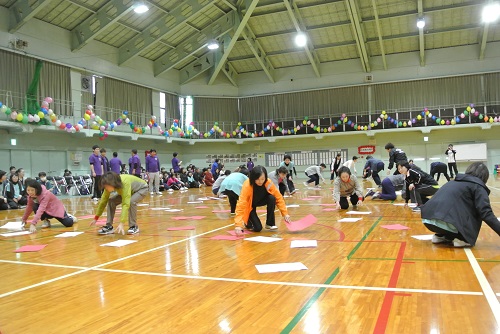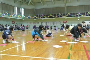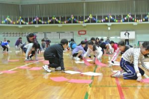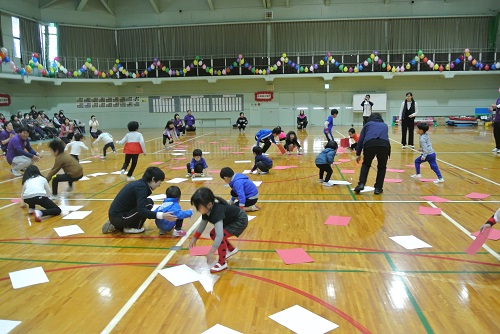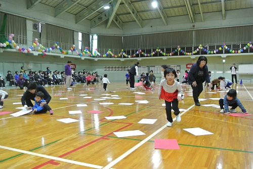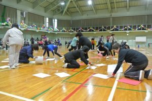 プログラム6番「カードめくり」です。紅白裏表のカードを、自分の組の色にひっくり返していきます。ハードな競技で午前の部が終了です。子どもの部から。