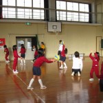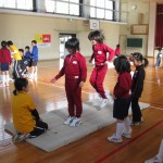 やまももクラブを開催しました。今日はマットの上でゴム跳びをしました。両足で跳んだり,片足で跳んだり笛の音に合わせて跳んだり。小さな子どもも上手に跳べました。その後,男女に分かれてバレーボールと野球の活動です。大きな子が小さな子にボールを投げてパスの練習をしました。